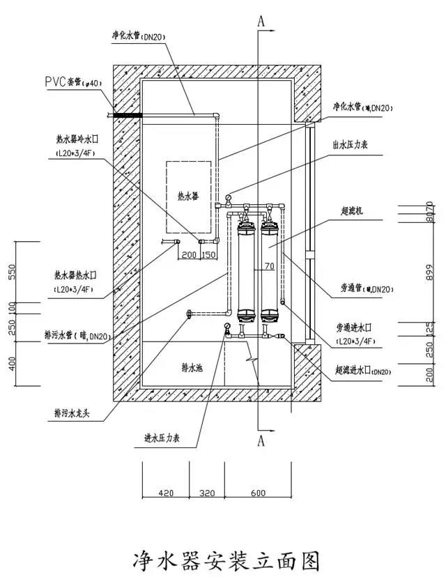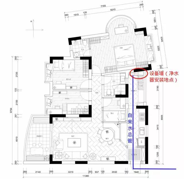 確定總水管先走到設備墻,中央凈水設備定位在這里