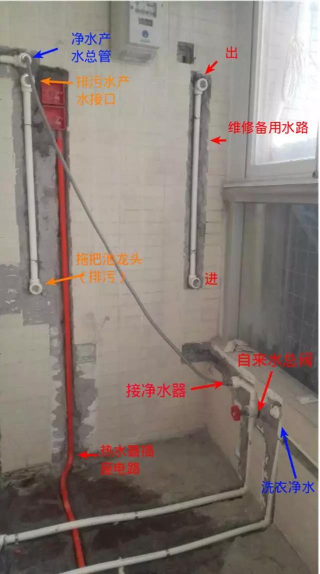 ③排污管和維修備用水路都開槽做了暗管,等封上槽補上瓷磚就好看了。其實明管也是可以的,不過你家那十級強迫癥肯定還是得暗管。