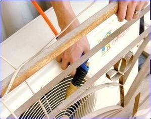 清洗空調器的蒸發器盤管和冷凝器時,可以直接用水管沖洗,如果沒有條件也可以用干的軟毛刷,刷去過濾網上的灰塵,清洗時一定要注意沿水平方向清洗,以免碰壞盤管的肋片。